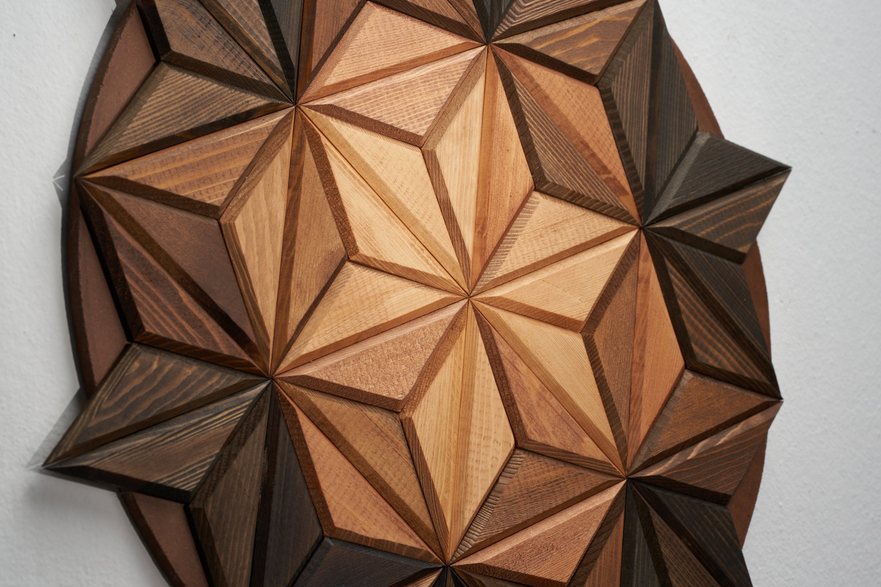 Zanaatkar İşçiliği: Her bir üçgen modül, milimetrik açılarla kesilerek manuel olarak birleştirilmiştir. Seri üretimden uzak, her parça ahşabın damar yapısına göre eşsizdir.
