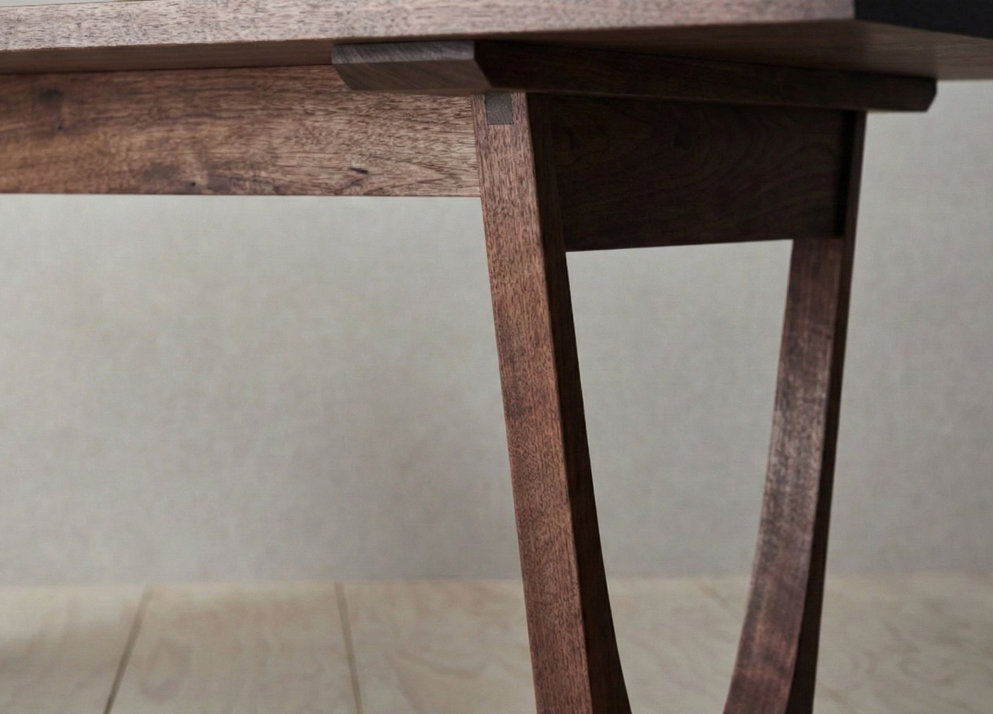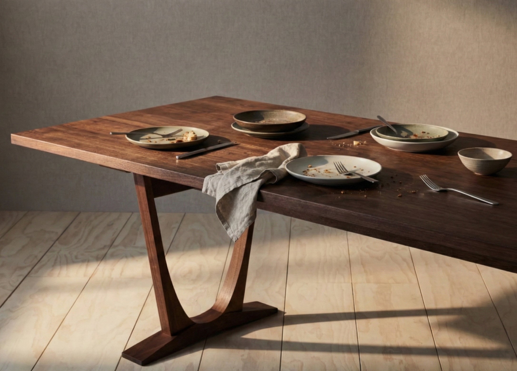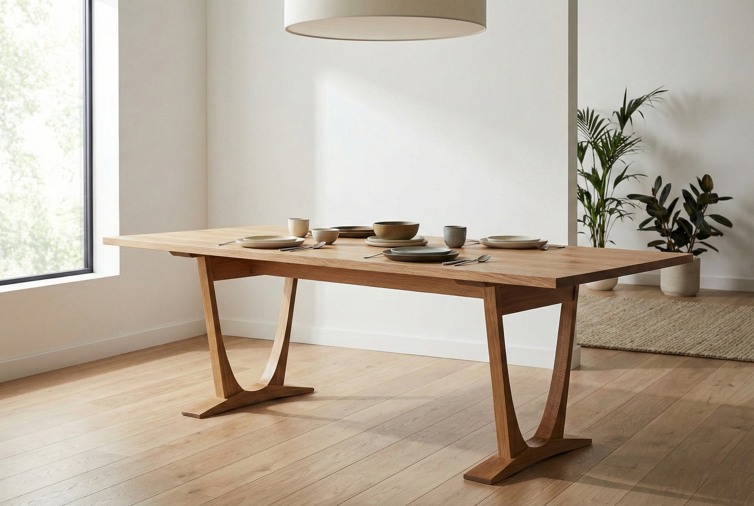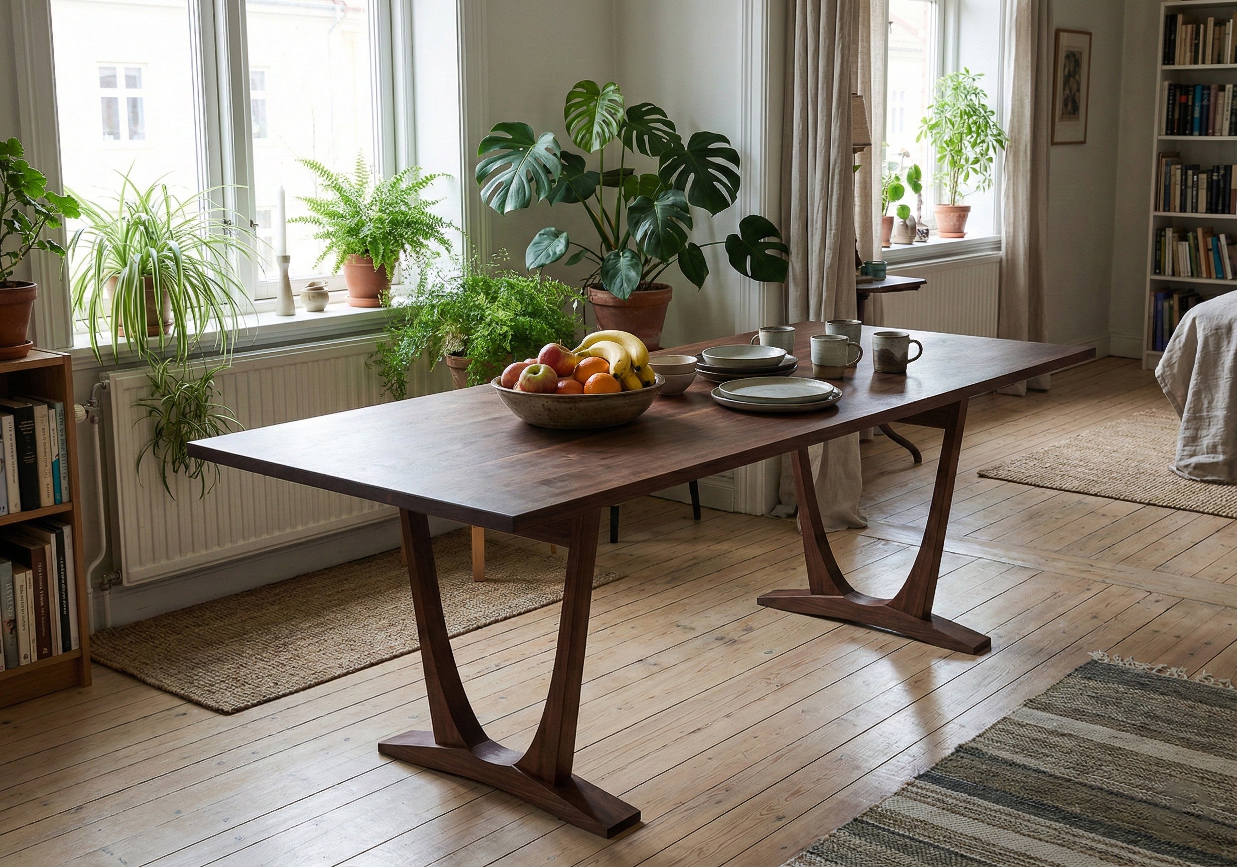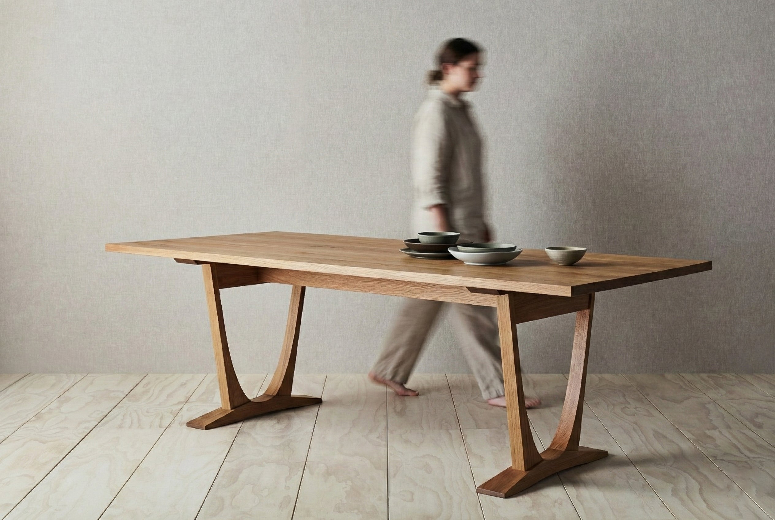 Tasarım Detayları: Masanın karakteristik kavisli ayak yapısı, ona havada süzülen hafif bir görünüm kazandırırken, masif ahşabın verdiği güven ve sağlamlıktan ödün vermez.
