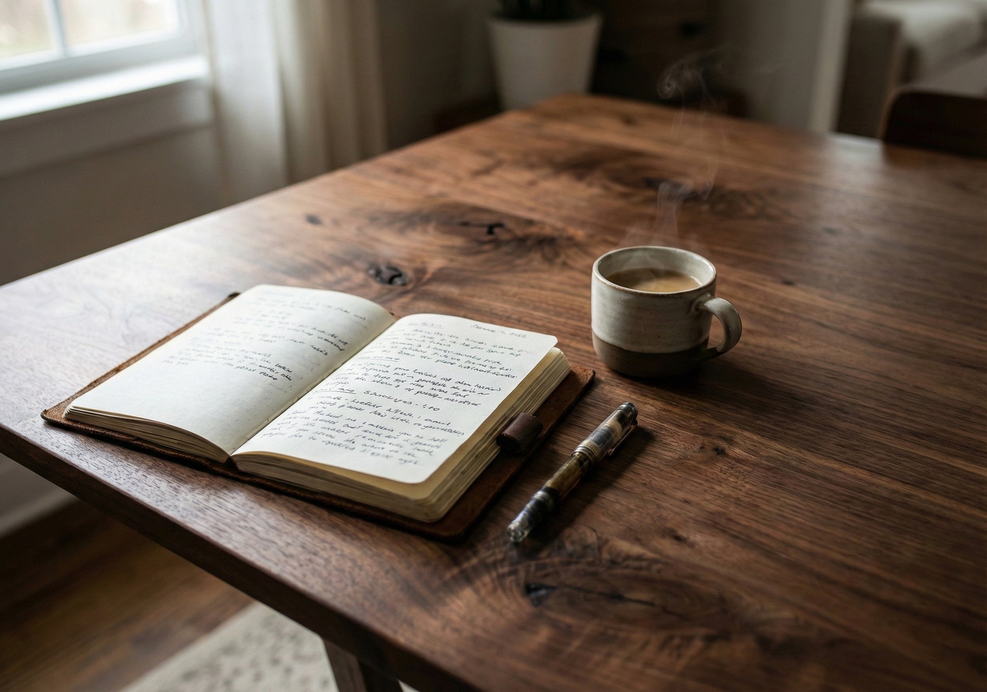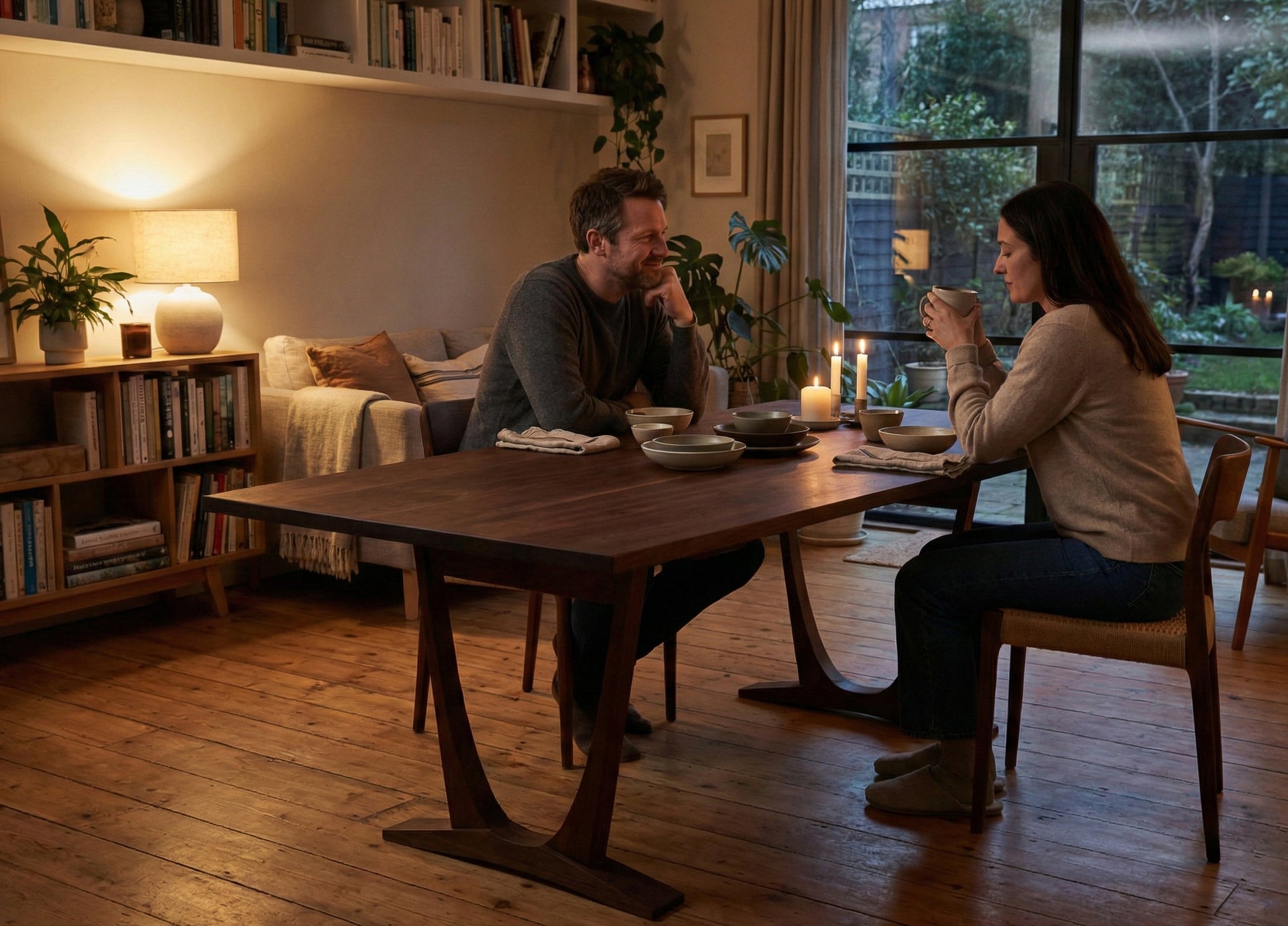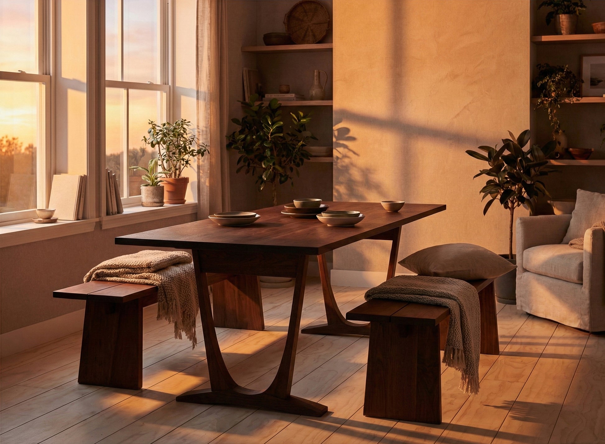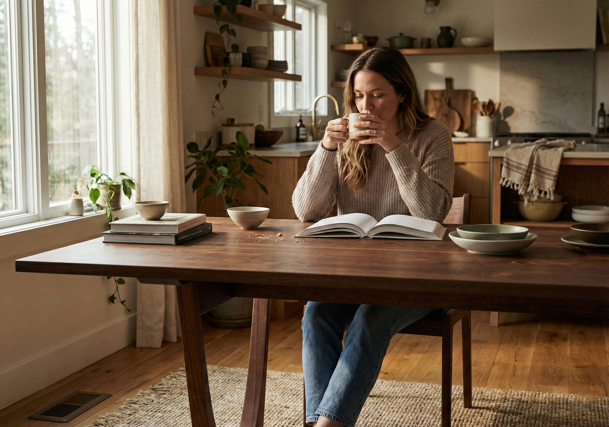 Doğal ışık, masif ahşap dokusu ve el işçiliği bir araya gelerek mekânda sakin ve dengeli bir atmosfer oluşturur.